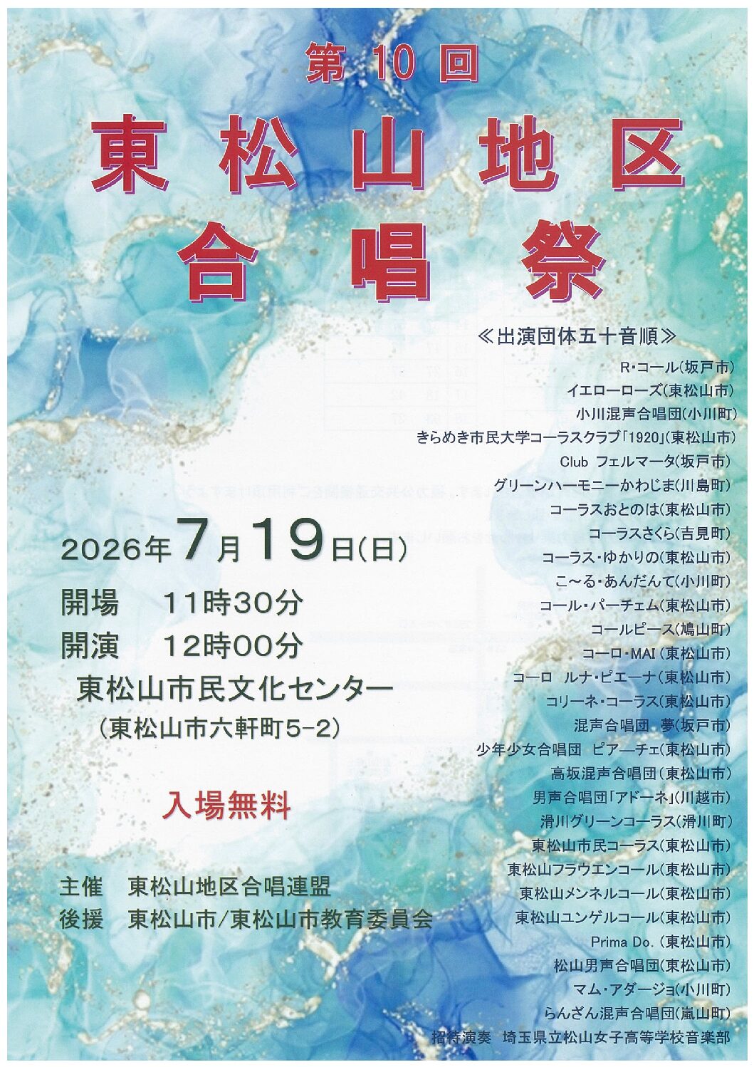 東松山ネクストアーティストプロフィール 公益財団法人東松山文化まちづくり公社が展開する「東松山ネクストアーティスト」プロジェクトで活躍する演奏家をご紹介いたします。(五十音順) 赤井香琳 埼玉県東松山市在住。3歳より…