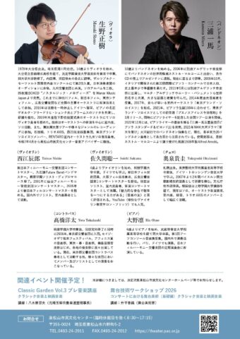 〈ヴィオラ〉生野正樹 Masaki Shono1978年大分県出身。埼玉県滑川町在住。14歳よりヴィオラを始め、大分県立芸術緑丘高校を経て、洗足学園音楽大学器楽科を首席で卒業、同大学大学院修了。内田博、岡田伸夫の各氏に師事。ザルツブルク=モーツァルト国際室内楽コンクールにて第2位入賞。日本演奏連盟のオーディションに合格、九州交響楽団と共演。ソロアルバムを三枚、四枚組BOXCD“ノスタルジック・メロディーズ”をWanar MusicJapanより発売。これまでに神奈川フィル、新日本フィル、東京シティフィル 、 広島交響楽団など全国の主要オーケストラに客演首席として参加。2016年は活動を一時休止しドイツへ留学、ピアノの名匠ゲオルク・フリードリヒ・シェンク氏とブラームスのソナタを共演し、研鑚を積む。2019年天皇陛下即位祝賀式典のオーケストラにてソロヴィオラ奏者を務めた。現在はオーケストラへの客演を中心に室内楽、ソロ活動、また、葉加瀬太郎ツアーや様々なジャンルのレコーディングに参加。石田組、トリオAXIS、昴21弦楽四重奏団、東京グランドソロイスツメンバー、RENTARO室内オーケストラ九州ソロ首席奏者。令和7年4月から東松山市民文化センター音楽アドバイザーに就任。