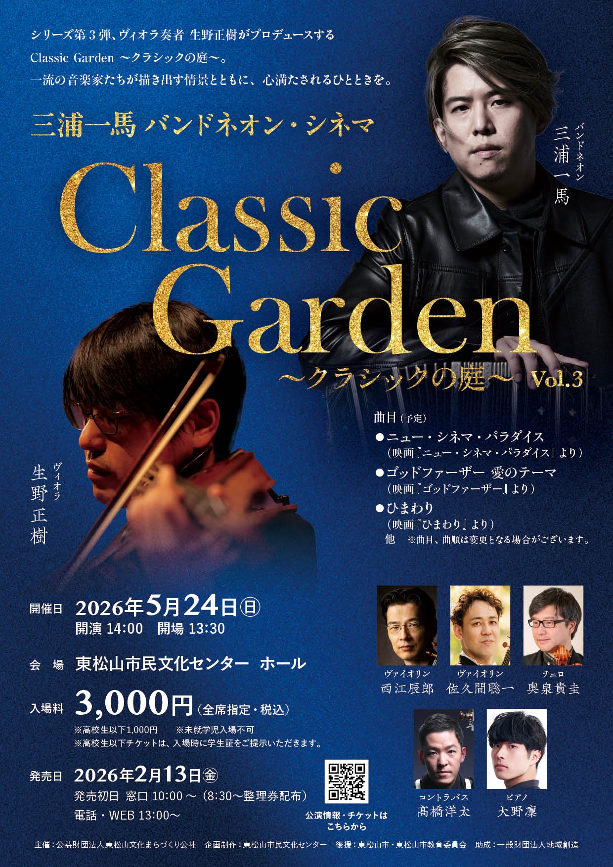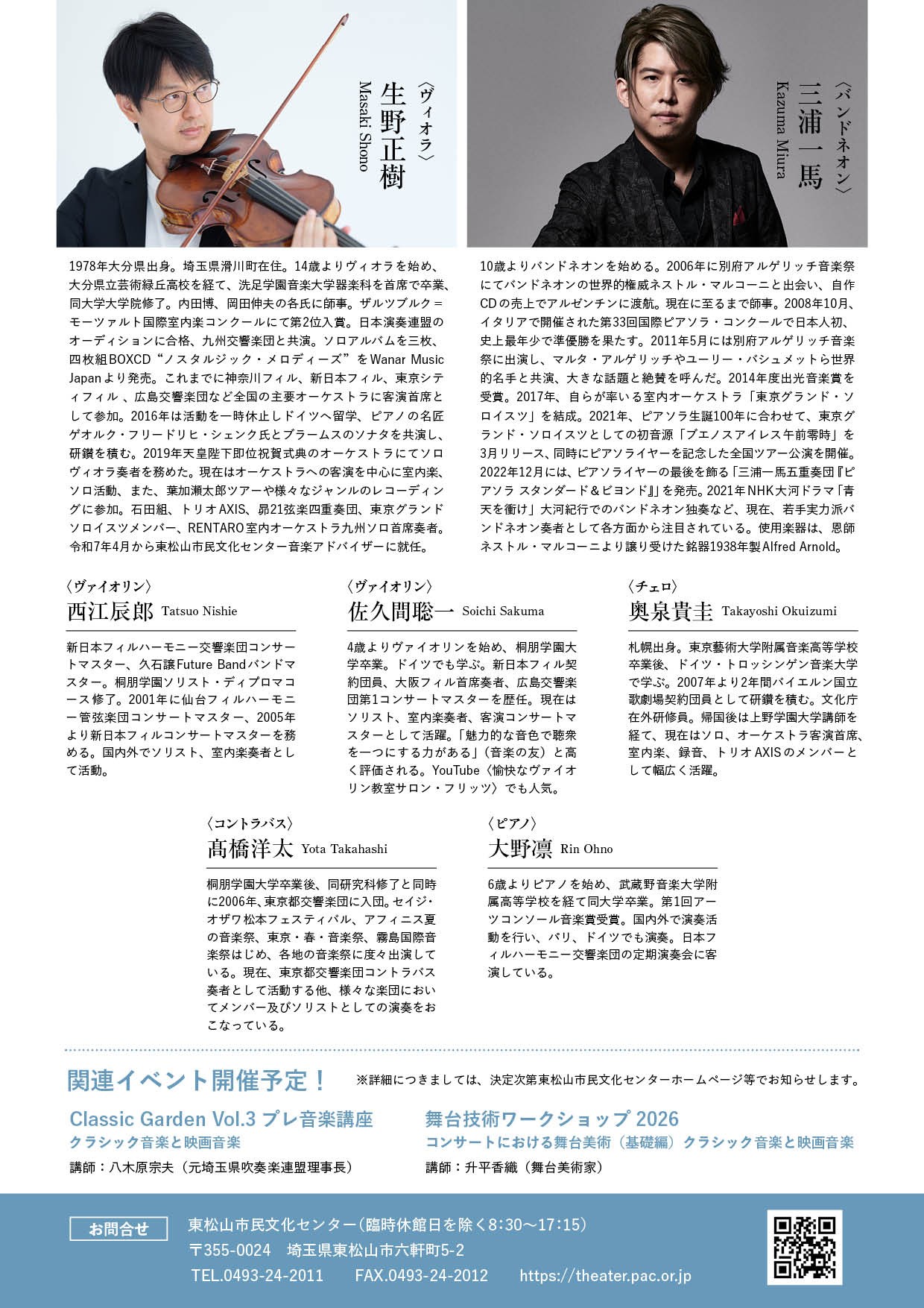 〈バンドネオン〉三浦一馬 Kazuma Miura10歳よりバンドネオンを始める。2006年に別府アルゲリッチ音楽祭にてバンドネオンの世界的権威ネストル・マルコーニと出会い、自作CDの売上でアルゼンチンに渡航。現在に至るまで師事。2008年10月、イタリアで開催された第33回国際ピアソラ・コンクールで日本人初、史上最年少で準優勝を果たす。2011年5月には別府アルゲリッチ音楽祭に出演し、マルタ・アルゲリッチやユーリー・バシュメットら世界的名手と共演、大きな話題と絶賛を呼んだ。2014年度出光音楽賞を受賞。2017年、自らが率いる室内オーケストラ「東京グランド・ソロイスツ」を結成。2021年、ピアソラ生誕100年に合わせて、東京グランド・ソロイスツとしての初音源「ブエノスアイレス午前零時」を3月リリース、同時にピアソライヤーを記念した全国ツアー公演を開催。2022年12月には、ピアソライヤーの最後を飾る「三浦一馬五重奏団『ピアソラ スタンダード&ビヨンド』」を発売。2021年NHK大河ドラマ「青天を衝け」大河紀行でのバンドネオン独奏など、現在、若手実力派バンドネオン奏者として各方面から注目されている。使用楽器は、恩師ネストル・マルコーニより譲り受けた銘器1938年製Alfred Arnold。